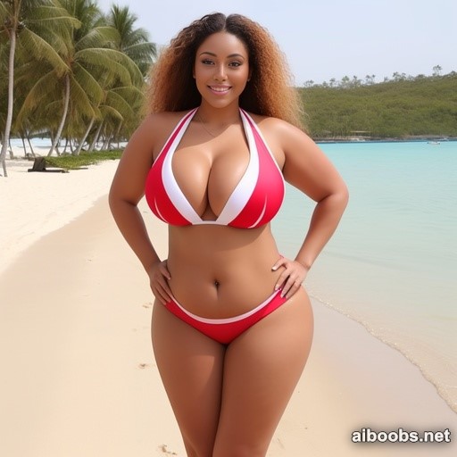Busty ebony bombshell in bikini posing on a beach